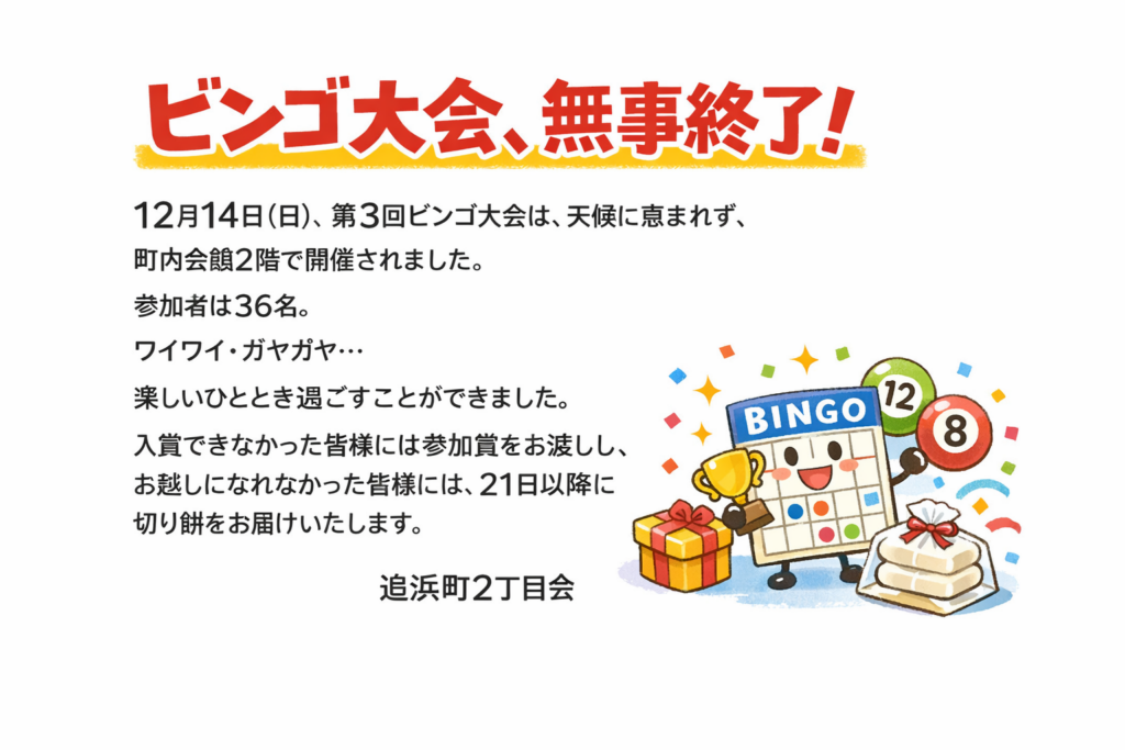 さて、今年も残すところあとわずかとなりました。日頃より町内会活動にご理解ご協力をいただき、心より感謝申し上げます。つきましては、来る年の瀬に、皆で賑やかに一年を締めくくる恒例の「年忘れビンゴ大会」を下記のとおり開催いたします!